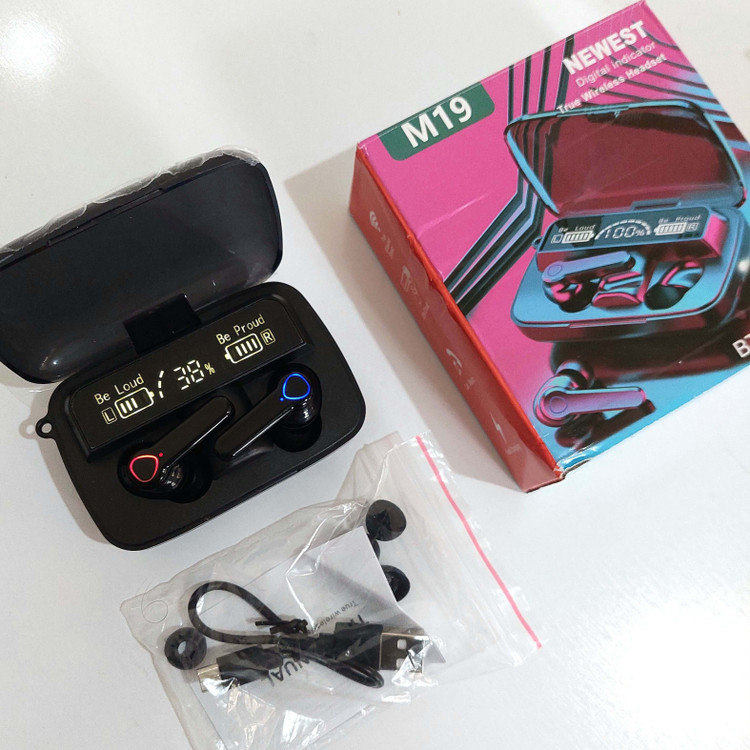 ایرپاد m19 نسخه های مختلف و درجه 2 و 3 داره که پاوربانک و کیفیت صدای ضعیف تر و بلوتوث قدیمی تری دارن اما ایرپادی که فروشگاه ما تقدیم شما میکنه بهترین نسخه و درجه 1 بازاره، m19 تنها ایرپاد زیر 300 هزار هست که چراغ قوه و پاوربانک رو باهم داره و ضد رطوبت و تعریق و پاشش آب هست